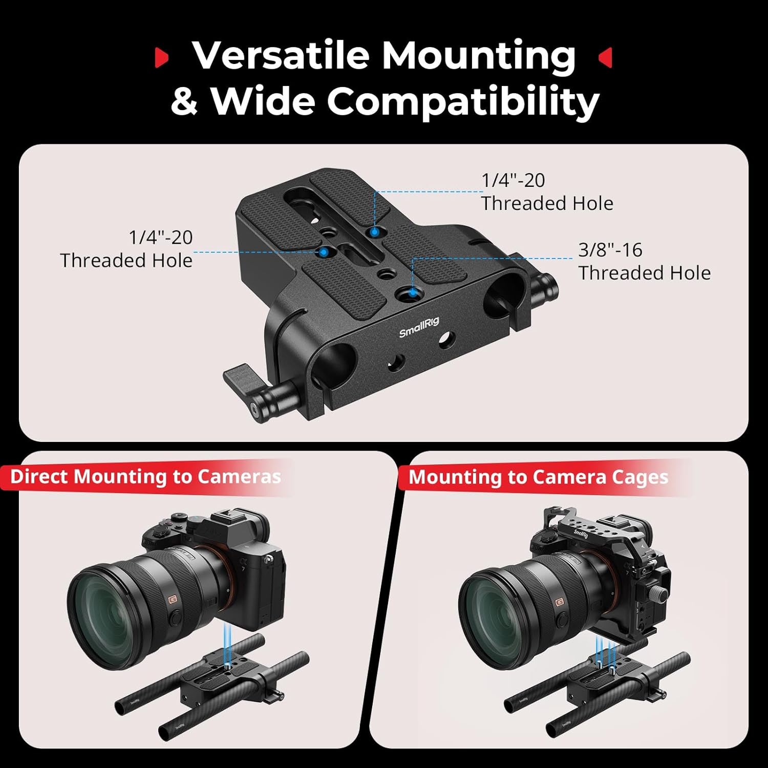 • 【Scientific Thread Arrangement】With 1/4”-20 & 3/8”-16 threads on the bottom, this base plate can be attached to quick release plate and then be attached on tripod such as SmallRig FreeBlazer Carbon Fiber Tripod 3989 (not included).